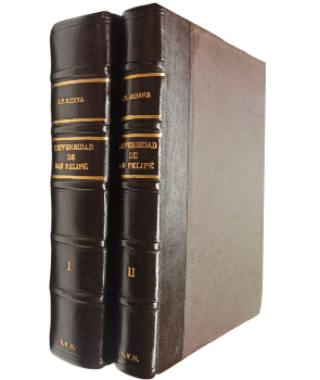 (OS43) - Santiago de Chile - 2 tomos - Publícase a expensas de la Comisión Oficial Organizadora de la Concurrencia de Chile a la Exposición Ibero-Americana de Sevilla - Tomo I: Texto. XII+650 páginas - Tomo II: Documentos. 373 páginas - Ambos ejemplares encuadernados en medio cuero café, con detalles dorados en lomos - Guardas marmoladas - Escaso desgaste - Interior bien conservado - Pequeña restauración en última página de tomo primero por dueño anterior - Buen estado |