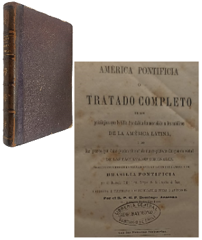 (OO21) - Santiago de Chile - América Pontificia o Tratado Completo de los Privilejios que la Silla Apostólica ha Concedido a los Católicos de la América Latina, i de las gracias que estos pueden obtener de sus respectivos Obispos en virtud de las facultades decenales - Traducción libre de la obra escrita en Latín con el título de Brasilia Pontificia por el Reverendo Reverendo Padre Simón Márquez de la Compañía de Jesús - Corregida e ilustrada por el R. P. F. Domingo Aracena de la Orden de Predicadores - Contiene XVII+741 páginas - Encuadernado en medio cuero café - Desgaste en lomo, tapas, perímetros y puntas - Algunas páginas con pintas de óxido - Dedicado y firmado por dueño anterior en hoja de respeto - Timbre de dueño anterior en portada - Correcto estado |