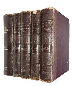 (Vit) - Buenos Aires - 5 volúmenes - Prefacio por el Dr. Sebastián Soler - Edición al cuidad de Roque Depalma editor - Tomo I: El Derecho Penal-El Delito. XVII+642 páginas - Tomo II: El Delito (Continuación)-La Pena-Medidas de Seguridad y Sanciones Civiles. XIII+485 páginas - Tomo III: De Los Delitos en Particular. XVIII+623 páginas - Tomo IV: Delitos en Particular (Continuación). XIII+524 páginas - Tomo V: Delitos en Particular (Cont.)-Contravenciones en Particular y Apéndice: Código Penal Italiano. XVIII+533 páginas - Los 5 volúmenes encuadernados en medio vinilo de color café - Desgaste en lomos, algunas tapas y bordes - Tomo IV con pequeña merma en borde superior - Timbre dueño anterior en portadas y cantos superiores - Buen estado |