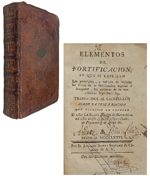 (OE52) - Madrid - Elementos de Fortificacion, en que se Explican los Principios, y Método de delinear las Obras de la Fortificacion Regular e Irregular, los Sistemas de los más Célebres Ingenieros - Traducidos al Castellano sobre la Sexta edición que se escribió en francés el Señor Le-Blond Maestro de Matemáticas del señor Delfín, y de los señores Condes de Provenza y de Artois - Contiene XXX+382 páginas - Encuadernado en cuero completo de época, con parche y letras doradas en el lomo - Guardas y cantos marmolados - Contiene 17 láminas desplegables con planos, faltan las n° 1,7,8, 17 y 20 - Desgaste natural en lomo, tapas, perímetros y puntas - Firma y marca de dueño anterior en contra tapa y portada - Algunas pintas de óxido - Suciedad en tapas - Láminas con algunas pintas de óxido y pequeñas roturas - Algunas láminas arrancadas - Interior bien conservado - Regular estado