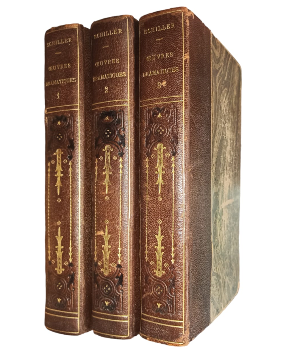 (TV8) - Paris - 3 tomos - Traduction de M. de Barante - Nouvelle édition entiérement revue - Avec une étude sur Schiller des notices sur chaque piéce et des notes - Tomo I: Étude sur la Vie de Schiller, Les brigada, Las conjuration de Fiesque et Intrigue et amour. Contiene XCVI+400 páginas - Tomo II: Don Carlos, Wallenstein: I. Le camp de Wallenstein. II. Les Piccolomini. III. La mort de Wallenstein. Le misanthrope et Seméle. Contiene 495 páginas - Tomo III: Marie Stuart, Le Pucelle d´Orleans, La fiancés de Messine, Guillaume Tell et Plans et Fragments. Contiene 538 páginas - Ejemplares encuadernados en medio cuero color café, con letras doradas en lomos - Tapas y guardas marmoladas - Desgaste en lomos, tapas, perímetros y puntas - Algunas páginas con marcas de óxido - Algunas páginas intonso - Buen estado |
