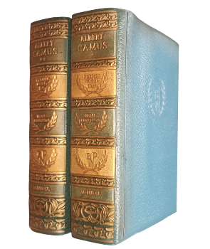 (LC4D) - México D.F - 2 tomos - Biblioteca Premios Nobel - Tomo I: Narraciones. Teatro. Contiene: El extraño, La peste, La caída, El exilio y el reino, Calígula, El malentendido, El estado de sitio y los Justos. Traducción y prólogo de Federico Carlos Sáinz de Robles - Tomo II: Ensayos. Contiene: Anverso y reverso, Bodas, El mito de Sísifo, Cartas a un amigo Alemán, Actualidades I, II y III, EL hombre rebelde, El verano y Discursos de Suecia. Traducción y prólogo del catedrático Doctor Julio Lago Alonso - Tomo I y II contienen 1188 y 1148 páginas respectivamente - Encuadernación original de editorial en vinilo completo celeste, con parches amarillos en lomo - Letras doradas en lomos - Guardas ilustradas - Retrato de autor en frontispicio - Desgaste en lomos - Tapas levemente manchadas y descoloradas - Aceptable estado |
