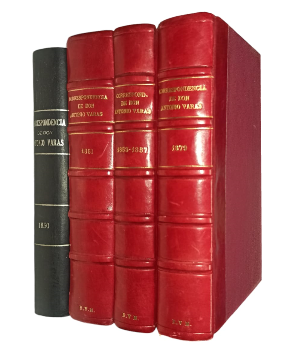 (TAE5) - Santiago de Chile - 4 tomos - Tomo I: (Año edición 1921) Sobre Candidatura Presidencial de Don Manuel Montt 1850. Prólogo de Don Alberto Edwards. LXXVI+338 páginas - Tomo II: (Año edición 1924) Sobre Elecciones Presidenciales y Revolución en la Provincia de Aconcagua 1851. Prólogo de Don Carlos Tomás Vicuña Mackenna. Introducción de Miguel Varas Velásquez. XLVII+419 páginas - Tomo III: (Año edición 1919) Con el Almirante Don Manuel Blanco Encalada Sobre su Misión en Europa 1853-1857. Prólogo de D. Augusto Orrego Luco. Introducción de Miguel Varas Velásquez. XXXVIII+284 páginas - Tomo IV: (Edición año 1918) Sobre la Guerra del Pacífico, con los Señores Eulogio Altamirano General Don José Francisco Gana, Don Francisco Puelma, Coronel Don Cornelio Saavedra, Don Domingo Santa María, Don Rafael Sotomayor, Coronel Don José Velásquez y Don Rafael Vial. Actas del Ministerio Varas-Santa María, Abril-Agosto 1979. Introducción de Miguel Varas Velásquez. XVIII+371 páginas - Tomo I encuadernado en media tela de color azul - Tomos II, III y IV encuadernado en medio cuero de color rojo, con letras doradas en lomos y guardas marmoladas - Leve desgaste en lomos y puntas - Tomo IV con algunas páginas subrayadas con lápiz de grafito por dueño anterior - Tomo I firmado y dedicados por dueño anterior - Buen estado |