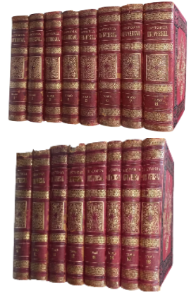 (VIT ) - Barcelona - 16 tomos - Escrita parcialmente por reputados profesores alemanes, bajo la dirección del eminente historiógrafo Guillermo Oncken - Historias generales de los grandes pueblos-estudios de las grandes épocas monografías de los grandes hechos-biografías de los grandes hombres - Traducción directa del alemán revisada por Don Nemesio Fernández Cuesta - Contienen: Historia del Antiguo Egipto, Historia de Babilonia y Asiria, Historia de la India Antigua, Antigua Persia, De los Fenesios, Grecia y Roma, Del Pueblo de Israel, Del Imperio Romano, De los Estados de la América del Norte y la Guerra Separatista, La Epoca del Emperador Guillermo, Cronología Universal seguida de listas cronológicas y cuadros genealógicos hasta 1883 por C. Dreyss, Historia del Traje, entre otros temas - Ejemplares encuadernados finamente en medio cuero rojo, con adornos dorados en lomos y tapas - Adornos en tapas - Contiene ilustraciones y variadas láminas en blanco y negro, en color, desplegables y fotografías - Desgaste en lomos, tapas y puntas - Algunos lomos con mayor desgaste y pequeñas mermas en bordes - Interiores bien conservados - Buen estado general |