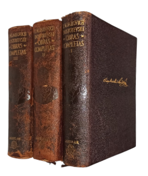 (BBA6) - Madrid - 3 tomos - Traducción directa del ruso, introducción, prólogos, notas y censo de personajes por Rafael Cansinos Assens - Con 20 ilustraciones reproducidas de la edición rusa de Leonid Grossman "Vida y obras de F. M. Dostoyevski" - Tomo I (1844-1865). Contiene: Pobres gentes, El Señor Projarchin, Corazón débil, La mujer ajena y el hombre debajo de la cama, Memorias de la casa muerta, Memorias del subsuelo, Noches blancas, entre otros títulos. 1563 páginas - Tomo II: (1866-1876). Contiene: Crimen y castigo, El jugador, El idiota, El eterno marido, El adolescente, entre otros títulos. 1927 páginas - Tomo III: (1879-1881). Contiene: Los hermanos Karamásovi, Diario de un escritor, Vida de un gran pecador, entre otros títulos. 1808 páginas - Ejemplares encuadernados en cuero completo original de editorial, con detalles dorados en lomos y tapas - Retrato de autor en frontispicio de cada ejemplar - Guardas y cantos ilustrados - Hoja de papel tipo biblia - Desgaste en lomos, perímetros y puntas - Tomo II y III con el material levemente descascarado en lomos - Borde inferior de lomos con leve merma - Correcto estado